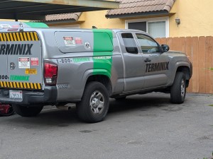 ‘Yeah. See, what we do is, we ask the customer to wait outside the home while we do the job. The chemicals we use are really strong. We don’t allow anyone in the home while we’re working.’